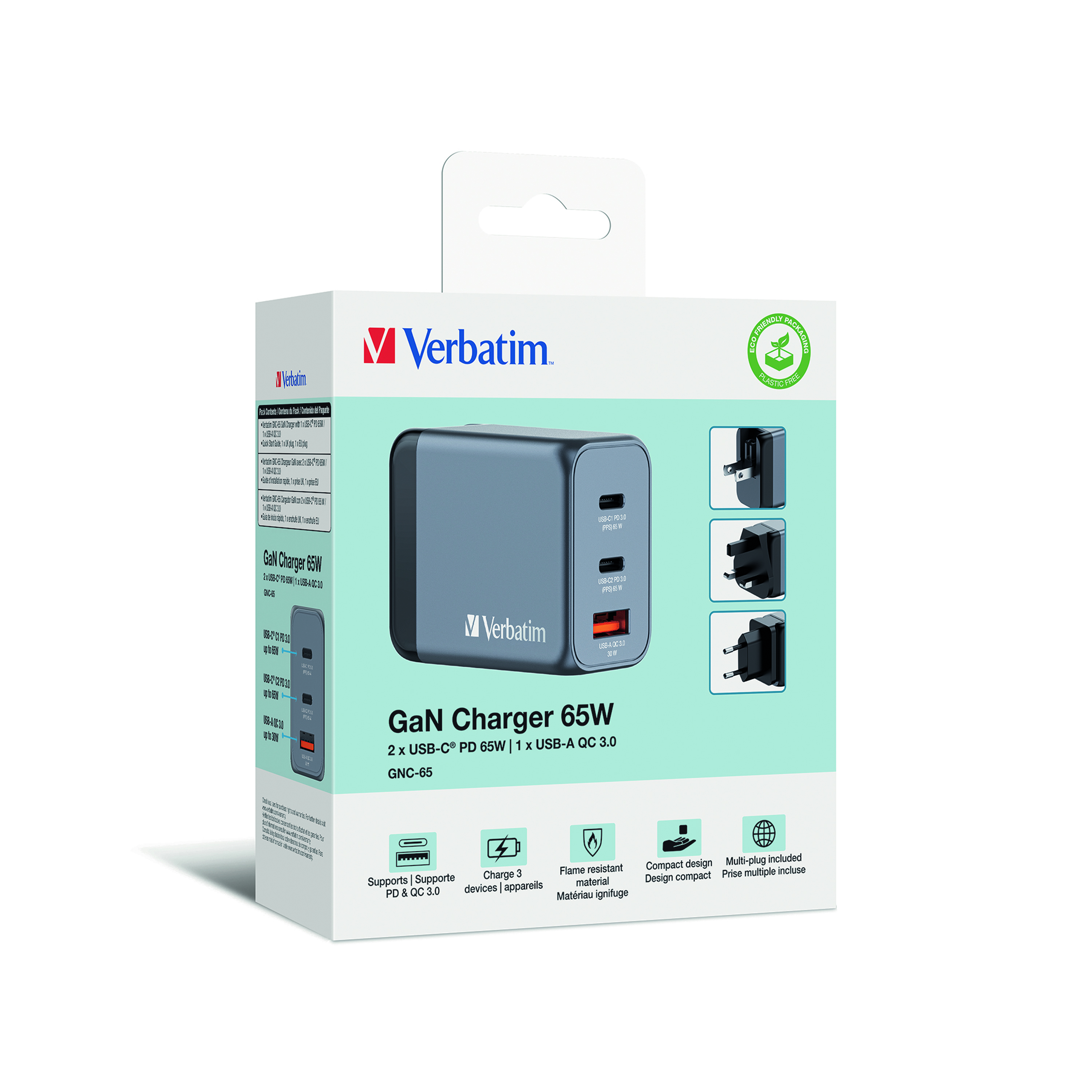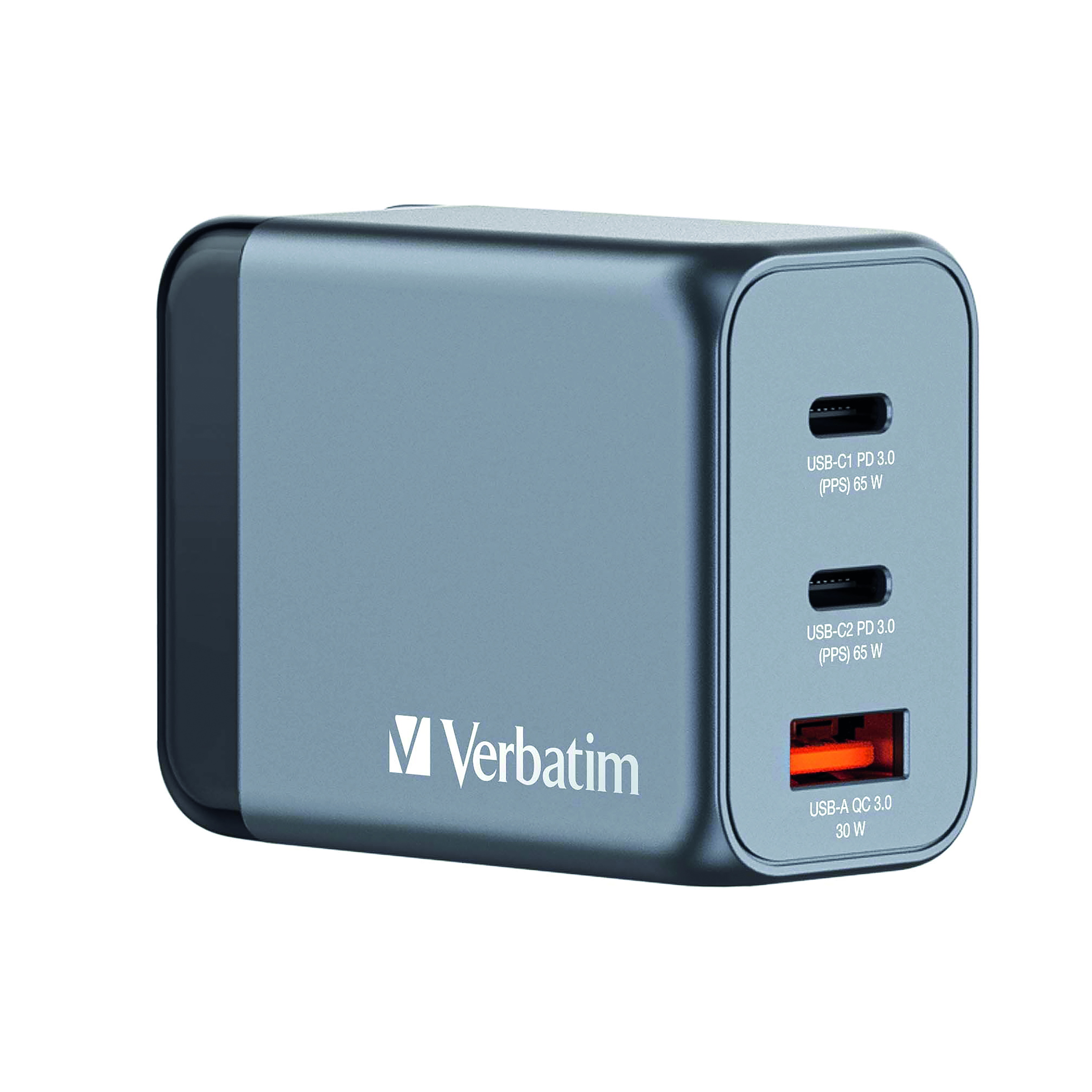 Verbatim's 65W GaN Wall Charger combines two USB-C PD 65W ports and one USB-A QC 3.0 port in a sleek, palm sized design. Ideal for the office, home or travelling to power your laptop, tablet, smartphone, gaming devices, and more. With its foldable US prongs and replaceable EU and UK plugs, it's the ultimate travel companion. Galliam Nitride (GaN) technology delivers high-powered, fast, efficient charging, and generates less heat. GaN chargers are smaller and lighter than traditional silicon-based chargers, making them ultra-portable and ideal for travel.