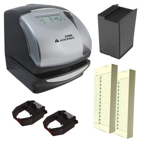 The ES900 electronic time stamp, numbering machine, and time and attendance recorder is a truly versatile device designed for an office setting. The internal battery keeps the clock running on time, even when power is down. The time stamp accommodates a wide variety of time cards, documents, and forms, so it's ideal for document control. The large, clear window makes it simple to perfectly align your documents. With over 300 possible print configurations and adjustable font sizes, the ES900 gives you practical printing options. It creates registrations in standard (AM/PM) or military (24 hour) format and prints time in minutes, seconds, tenths, hundredths, or consecutive numbering. To enhance communication, the ES900 provides 13 preset messages and three lines of user-programmable messaging, available in English, Spanish, German, French, Italian, or Portuguese. This time clock supports job costing to help you run your business more efficiently and is protected with a user-selected 4-digit numeric password.