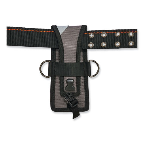 The Small Tool and Radio Holster secures channellocks, pliers, and other small hand tools, as well as radios and cell phones. An innovative modular buckle connection system on the back easily connects to standard tool belts and fall protection harnesses without the worker having to remove them. Tool lanyards can be attached to two D-rings on the holster for additional safety and security.
