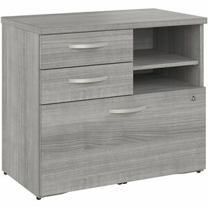 Hybrid Office Storage Cabinet with Drawers and Shelves offers a stylish, long-lasting workplace organization solution for the modern professional. Keep important documents, office supplies, work-in-progress and equipment in order so you can access the materials you need quickly and easily. A file drawer opens on smooth, full-extension, ball-bearing slides for an effortless reach to letter/legal/A4-size paperwork and can be locked to protect sensitive information. Two box drawers organize writing utensils, notepads and other supplies while the open shelves are ideal for frequently used items. Cabinet is thoughtfully designed for maximum stability and includes hardware to anchor the file cabinet with shelves to a wall, making it a safe choice for use in virtually any home or professional office environment.